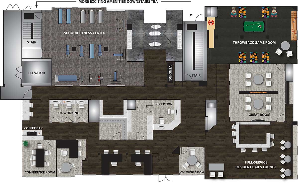 Not only is the space inside your luxurious apartment intelligently planned and fabulously finished, just down the hall, you will find an amenities collection that is unrivaled in the market. Explore the first floor of our club house below and stay tuned as we announce details on the lower level.